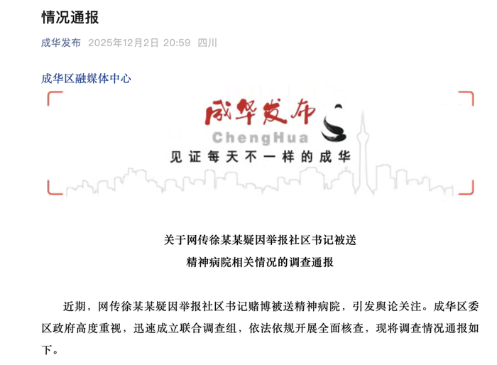 近日,网络上一则女子因向社区书记举报被送进精神病院的新闻引起广泛关注。随着舆论不断,12月2日,四川省成都市成华区联合调查组发布通报,公布了事件详情。通报显示,徐某某,女,1981年6月出生,系独生女。他单身,没有孩子。 2003年6月大学毕业后,因身体原因失业在家。他的父母早逝,他没有近亲。其母亲家族有精神病史。报道称,网上有关“徐某某在社区图书馆工作”的报道不实。经调查发现,帕玛亚南石油公司没有图书馆这个“文化活动综合中心”,他也没有在那里工作过。对于“社区书记陈某某涉赌举报”的说法,调查组证实成华区纪委并未收到徐某某的真实姓名或签名报告。 2016年8月30日,成华区纪委接到网上匿名举报,举报石油社区书记陈某某打麻将、赌博。经核实,举报内容不实。针对“患有精神病”这一主要问题,报道详细介绍,自2012年9月以来,有居民反映,许某经常表现出自己穿衣服、说话等异常行为,社区为其申请了低保,并给予了生活支持。 2015年10月,社区发现他多次翻垃圾桶寻找食物。 2016年3月,亲戚和社区共同将他送往医院,诊断为“精神分裂症”。成华区“民联”评定他为“二级精神文明建设者”因“无劳动能力、无谋生手段、无法律抚养人”,通过继承批准纳入集中供养。2017年1月,徐某某进入成都德康医院,这并非网上报道的“报复”。另外,专家调查组核实,医院对徐某某的诊疗符合标准,未采取封堵、电击等措施。网上发布的相关说法不实。目前,徐某的病情已稳定,体重已从入院时的35公斤增至61.5公斤,后续治疗视徐某某的治疗情况而定,他可以根据自己的意愿选择在成都德康医院或其他经济机构集中支援,也可以在家中分散支援。公众认为它嵌入在“强权压制弱者”的叙事框架中。尽管调查显示,匿名举报并非徐某某本人所为,且早于其被送往医院的时间,但时间线上的“统一”,仍引发舆论猜测是否存在未公开的冲突。此外,八年的治疗期限和近期的舆论高峰也引发了公众的质疑。尽管《通知》详细介绍了社区干预、医疗诊断、救助安置的全过程,体现了程序的完整性,但公众对程序背后是否存在“实质正义”的担忧并没有完全消除。例如,病情稳定的徐某某是否可以申请复查?未来渠道发布是否明确?社区能否提供有效的持续护理?这些问题仍需要社会持续关注。如果网络八卦存在故意造谣的,相关责任人也应当依法追究后果。北京大学政府管理学院教授马良指出,这起事件反映了当前一些领域应对舆情消极应对、拖延处理的现象。过去,事件发酵后才向当局通报。虽然有一定效果,但很难完全消除公众的疑虑。一些原住民管理仍存有“回避心态”,陷入“无民意不管理、民意多好管理、民意少少管理”的误区。他们把舆论视为“瘟疫”,不能不成为优化管理的契机。马良强调,对于思想上有病的群体,一方面要加强然后对社区进行日常监测和准确识别,及时响应他们的需求,推动专业机构提供温暖服务。另一方面,要避免“管控过度、关爱不足”的倾向,努力营造包容的社会环境,促进这一群体有尊严地融入社会。编辑:翟静 杨勤宇 编辑:崔新书 上一篇:外务省向日本提出三个问题! 下一篇:没有了